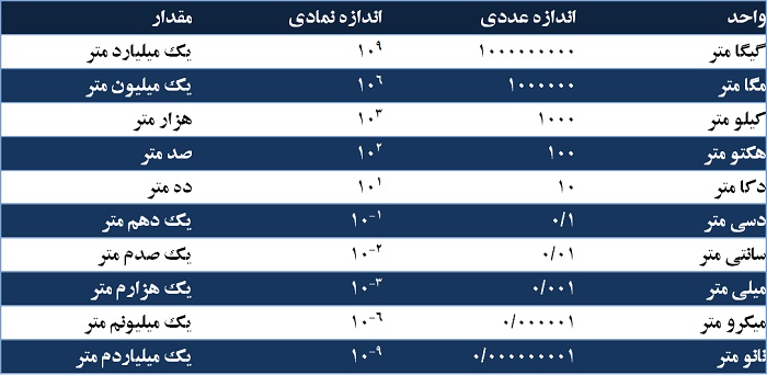 جدول1.مقیاسهای اندازه گیری به همراه نماد علمی