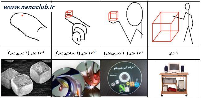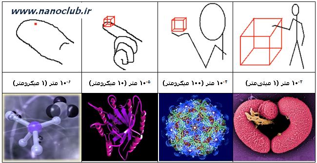 در میان اندازههای کوچک، نانومتر از اهمیت ویژهای برخوردار است که بعدها بیشتر در مورد علت آن صحبت خواهیم کرد. اما پیش از آن لازم است که درک صحیحی از این اندازه داشته باشیم. برای این منظور میتوانیم آزمایش بالا را ادامه دهیم؛ تا آنجا پیش آمدیم که دانههای نمک را به اندازهیک میز بزرگ کردیم. با این بزرگنمایی (1000 برابر)، قطرتارموی شما معادل یک طناب بسیار کلفت خواهد شد،میتوانید از گلبولهای قرمز برای تیله بازی استفاده کنید و باکتریها نیز همچون دانههای نمک قابل رویت میشوند (شکل 2).